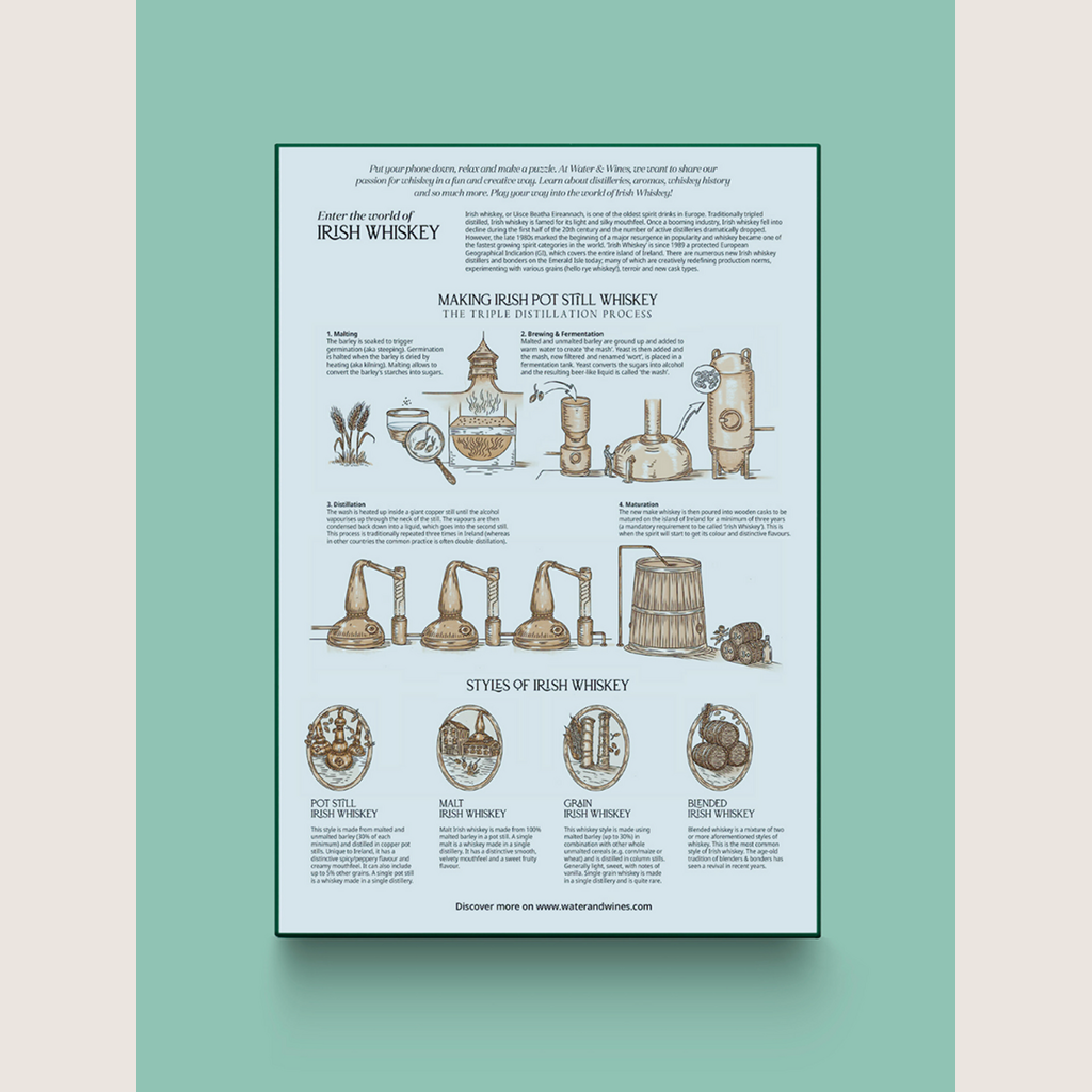 - A beautiful poster featuring hand-drawn illustrations and carefully selected stories about Irish whiskey,