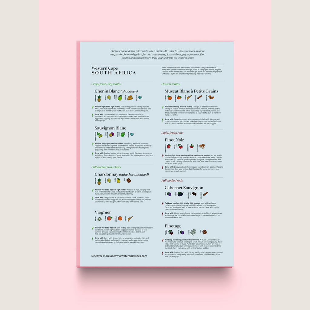 Carefully selected by expert sommeliers, the puzzle box features grape profiles and extensive food pairing tips, allowing you to explore the flavors and characteristics of local grape varieties. Discover each region and district as you complete the puzzle and deepen your appreciation of South Africa's rich wine culture.