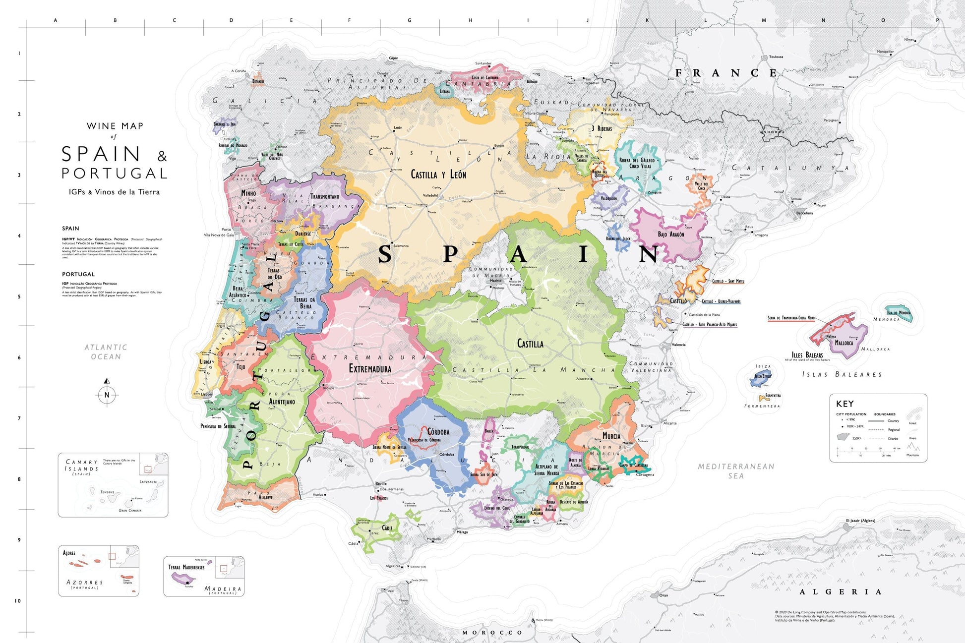 It covers all DOP (DOCa, DO, VP and VC) and IGP regions of Spain; all DOP and IGP regions of Portugal; detailed maps of Priorat and Rioja; adjacent regions of France, Morocco and Algeria.