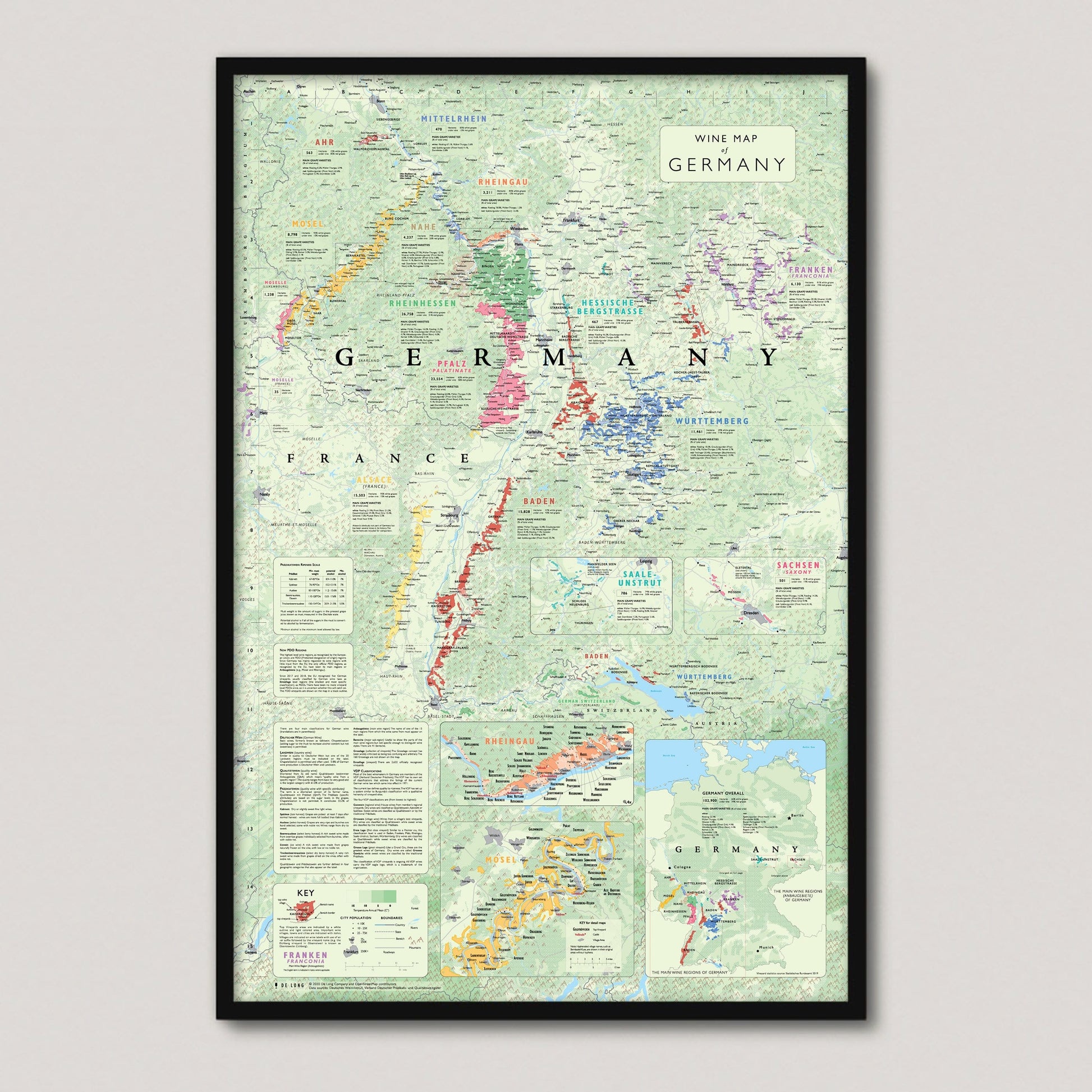Comprend : toutes les principales régions viticoles (Anbaugebiete) divisées en sous-régions (Bereich) et comprenant les principaux villages viticoles et cépages ; cartes détaillées du Rheingau et de la Moselle ; régions adjacentes de la France, du Luxembourg et de la Suisse.