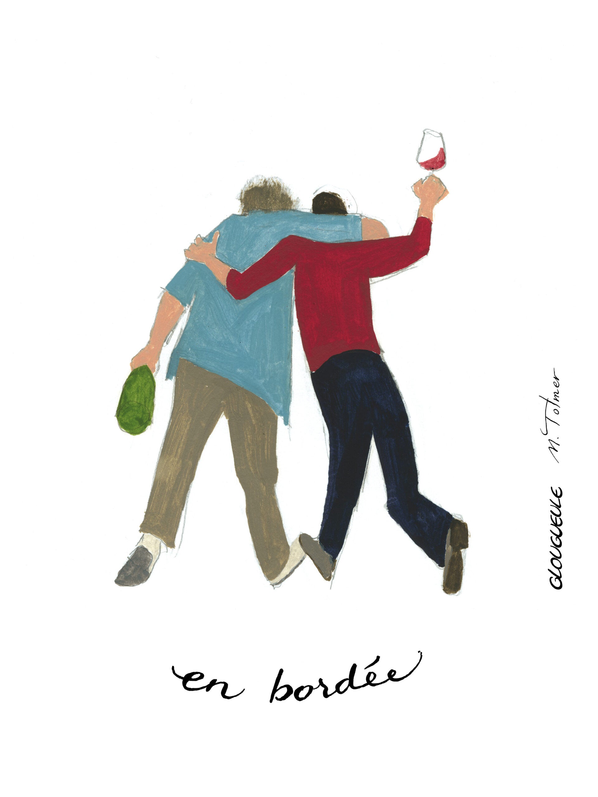Au départ, il y eut une photo, Mimi et Pierrot marchant en toute ébriamitié sur la petite route champêtre de Moulin Pey-Labrie. Puis cette interprétation peinte en couleurs qui tapa dans l’œil de Sylvie Augereau et Nicolas Reau, qui la reprit un temps pour sa cuvée « En bordée ». Un peu de vin et beaucoup d’amour.