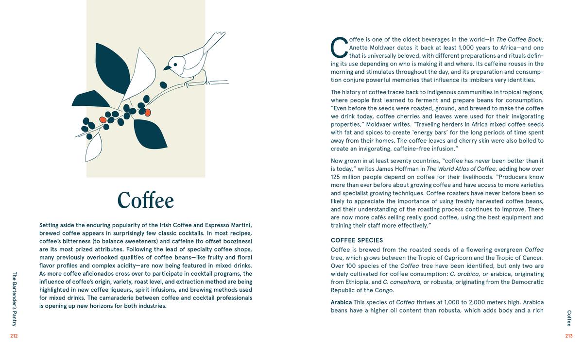 Le Bartender's Pantry comprend des aperçus concis de dix catégories d'ingrédients (sucres, épices, produits laitiers, céréales et noix, fruits, légumes, fleurs et herbes, café, thé, sodas et eaux minérales, et ferments) qui couvrent l'histoire moderne de chaque sujet dans le domaine des boissons, les pratiques de production courantes, les méthodes de transformation artisanales et les canaux de distribution courants, avant de proposer des conseils d'approvisionnement et de service provenant d'experts dans chaque domaine. Ces introductions abordent les défis auxquels sont confrontés les producteurs, les distributeurs et les consommateurs à mesure que les ingrédients progressent dans la chaîne alimentaire jusqu'à atteindre le garde-manger du barman.
